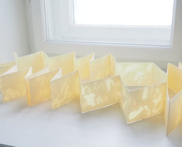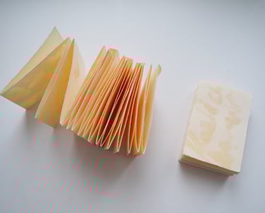 Inspired by this story, I rewrote it using butterfat on a piece of paper, which I folded into a butter-sized leporello. It spreads open like butter and, as butter would be, is enclosed in a case made from butter packaging paper.