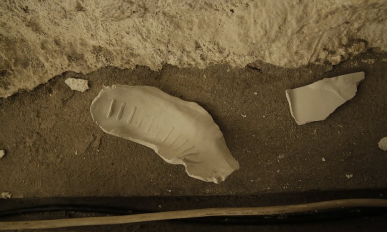 The exhibition took place in an underground gallery consisting of two tunnel-like corridors with no windows. My fragmented, imprinted pieces found their place tucked away in a small niche at the bottom of the stairs. The atmosphere – gathering traces of everyday surroundings and placing them below ground, illuminated by a strong projecting light – felt strangely archaeological to me…