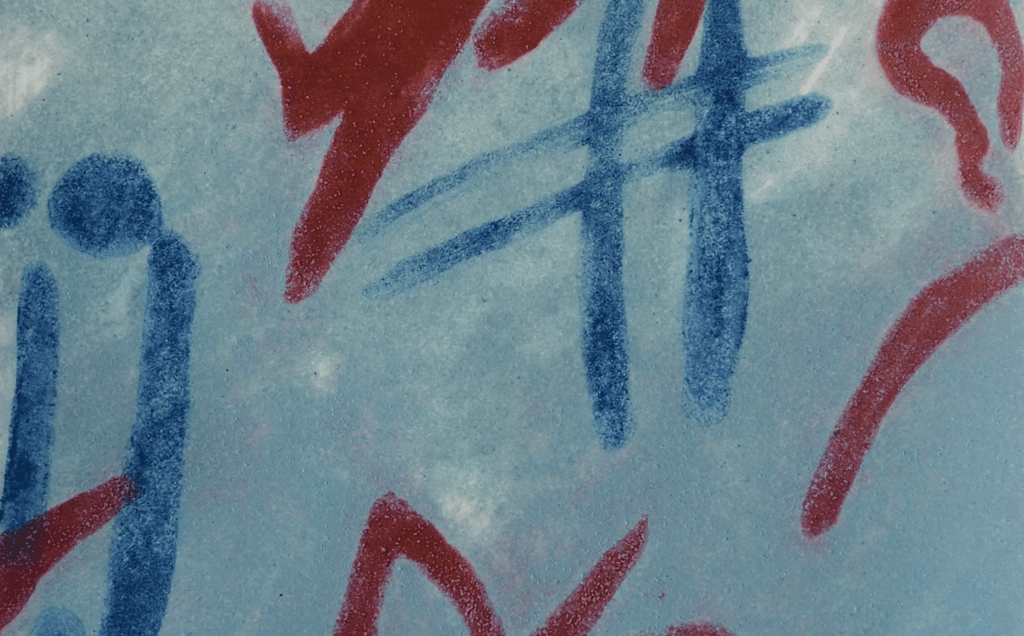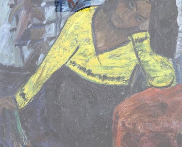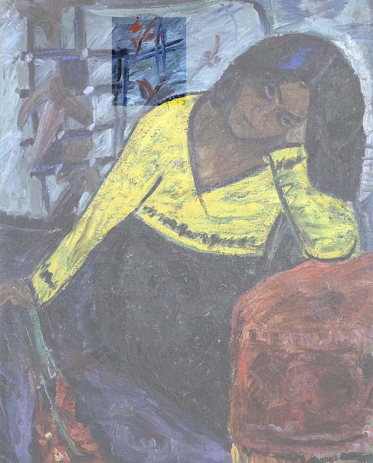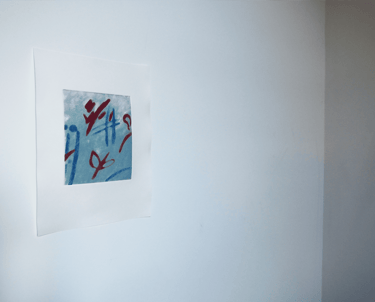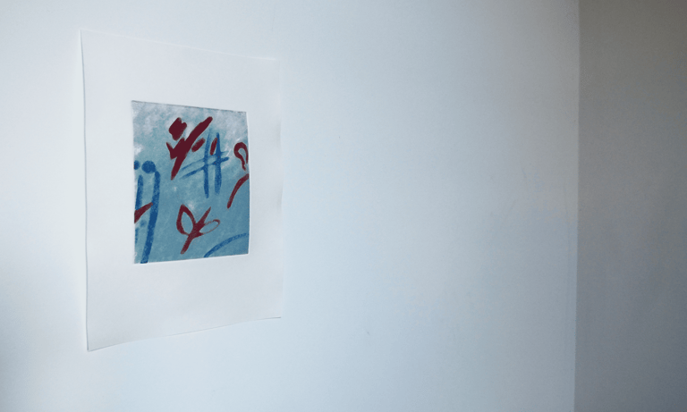 Samuolis’s canvases carry creative memory; it is known that he often painted over earlier works. This principle of concealment and persistence reappears in my print. Using three plates and three colours, I build the image through layers that cover and reveal one another, forming the final fragment.