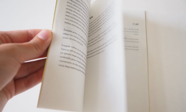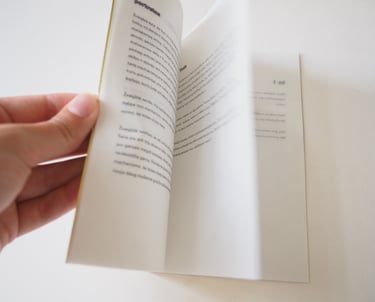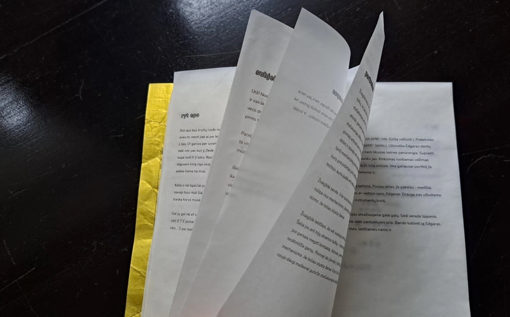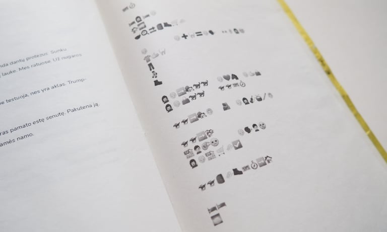 The book contains this short story retold in different versions, inspired by Raymond Queneau’s Exercises in Style, in which the same narrative is rewritten in countless ways. Here, the journey is retold backwards, with antiphrasis, without the letter “i”, in the style of Yoda, as a haiku, through emojis, as a typographical border matching the actual size of a block of butter, and in other variations.