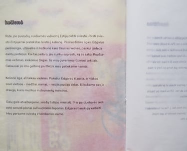 Journey is a short story based on my mother’s memory of childhood summers spent in a Latvian village near the Estonian border. It tells of my great-grandfather deciding to go to Estonia to buy butter. They have breakfast, prepare the carriage and horses, and along the way my great-grandfather tells stories about the trees they pass and the neighboring farms. They visit a friend, chat, sing – and eventually arrive at the most unremarkable little shop at the border to get the butter. As with many stories, it is about the journey, not the destination.