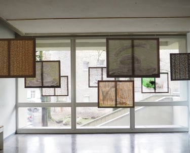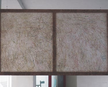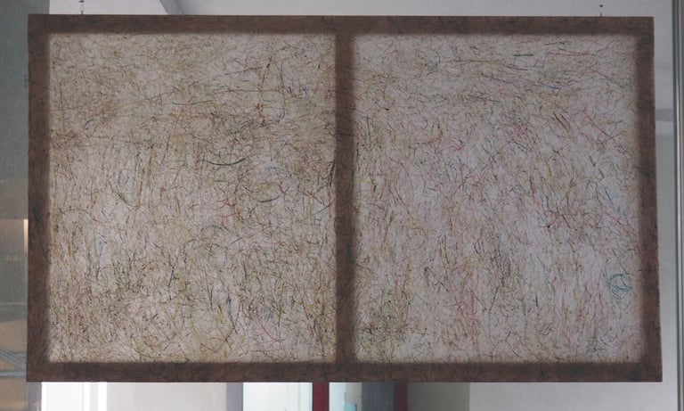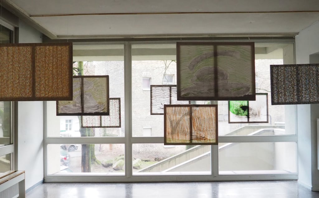The wooden frames divide the drawings into two parts, evoking associations with artist’s books, book spreads, and pages. These drawings unfold like transparent landscapes, illuminated by the sun as if seen through windows.