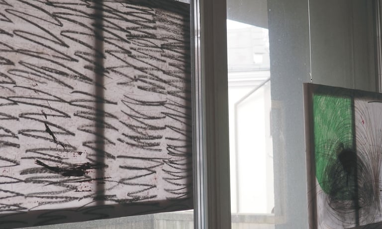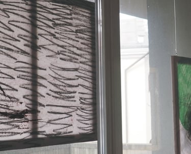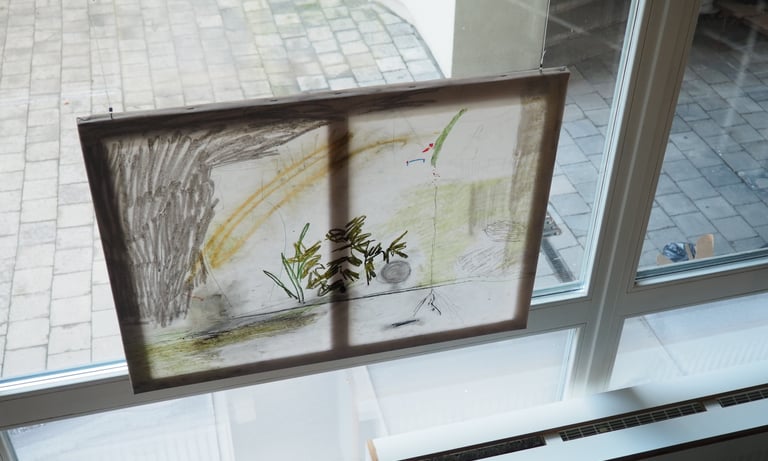 Transparent Windows is a series of drawings layered on transparent paper and mounted on wooden frames. The images shift as sunlight passes through, revealing different layers of drawing materials – pastel, graphite, markers, and ink. The works were exhibited in a space where viewers could move around freely and be able to see both sides of each piece.
