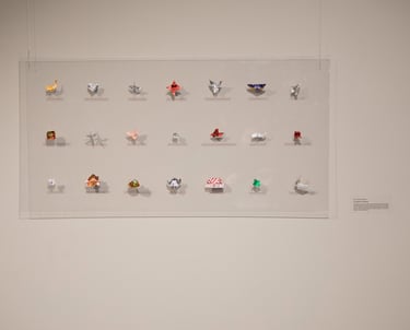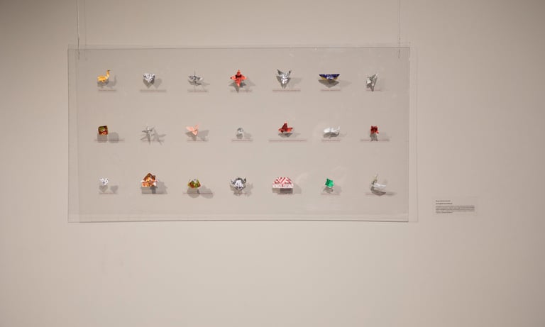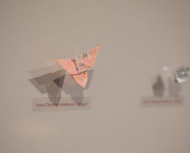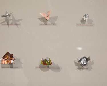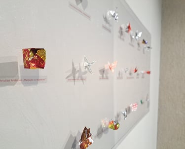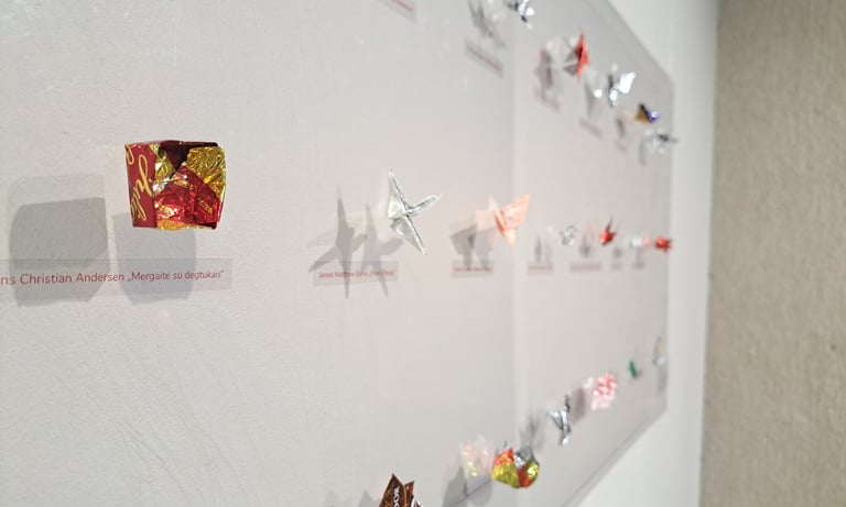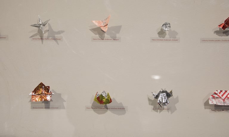 In a thrift store, I came across someone’s collection of candy wrappers. By refolding them, I created my own set of miniatures: shimmering colours, crinkled reflections, and a reimagined narrative of imagination – something sweet, familiar, and once seen. These playful miniatures echo imaginative storytelling, which I weave together with well-known fairy tale titles and books from a familiar childhood.